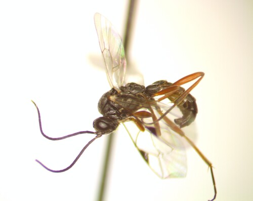 Female Gelis wasp that emerged today from spider eggs sacs that I collected from my yard on March 9.
