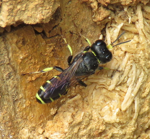 These wasps flit about from hole to hole on a spruce stump, entering some and then leaving to inspect others.\r\n\r\nBugGuide ID