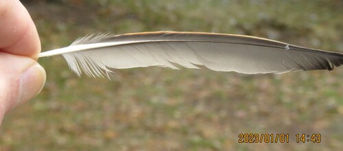 My previous observation was of a sharp-shinned hawk and its prey. \r\nThese are the feathers at the scene.