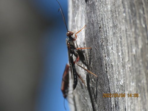 Male Xorides with a box elder bug in the background.
