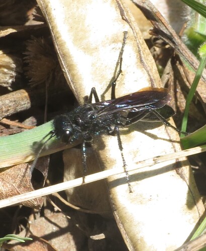 These are common visitors in the yard, especially in the spring. I often see them flitting about, digging nests, and dragging their paralyzed victims (cutworms - Noctuid larvae) back to their nests to feed their offspring. Female cutworm wasps dig their nests after catching and paralyzing their prey, which is opposite that of other wasps in the family Sphecidae. After dragging the caterpillar to the nest, a single egg is laid and the nest is closed and well concealed by covering with rocks and other debris.