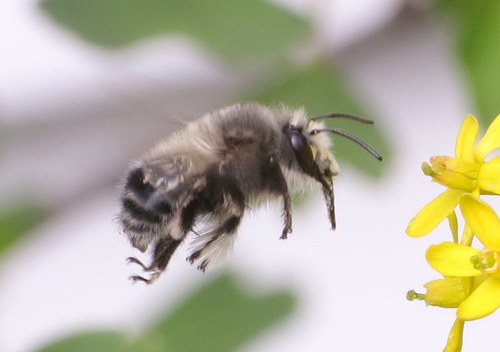 Fast moving, aggressive bee visiting golden currant flowers. Cold and windy ~ 7 degrees C.